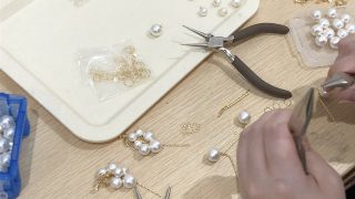 アクセサリーの制作風景を紹介します✨一つ一つ丁寧に、パールやパーツを繋げています。とても根気のいる作業ですが、楽しく進めてくれています!心のこもった、Chouchouオリジナルアクセサリーが完成💕